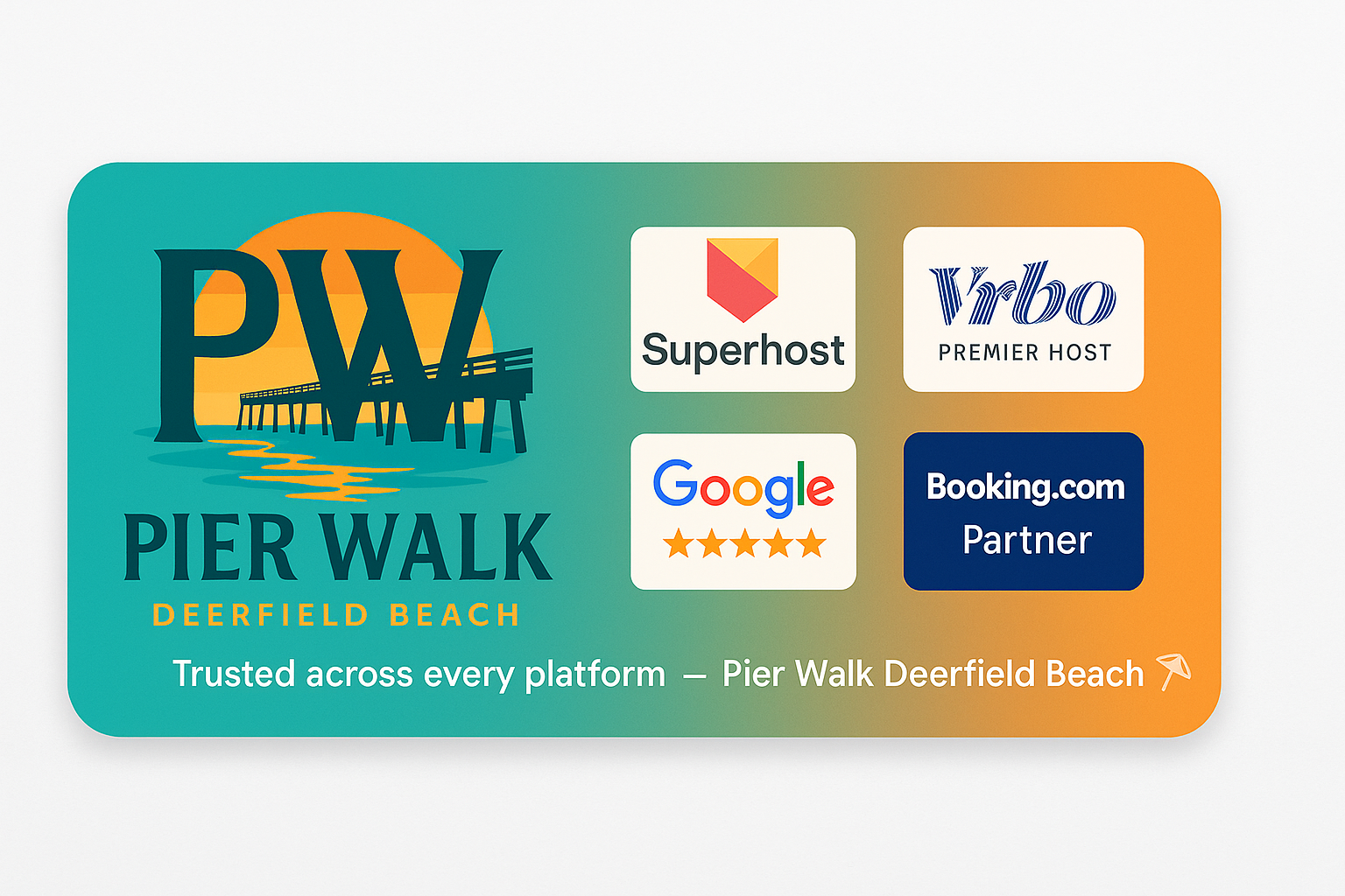 Pier Walk is a family owned and managed complex of 20 vacation apartments with 28 parking spaces on Deerfield Island: 12 studios, 7-one bedrooms, and one two-bedroom. It has 22 listings that can host anywhere from 1 guest up to 16 guests at a time for larger groups and families. It has a courtyard swimming pool, is one block from the beach and walking distance to the main shopping and entertainment strip. We're family-owned and managed with several hundred happy, returning guests. After booking, guests receive our detailed online local guidebook and property house manual so they can plan their stay.