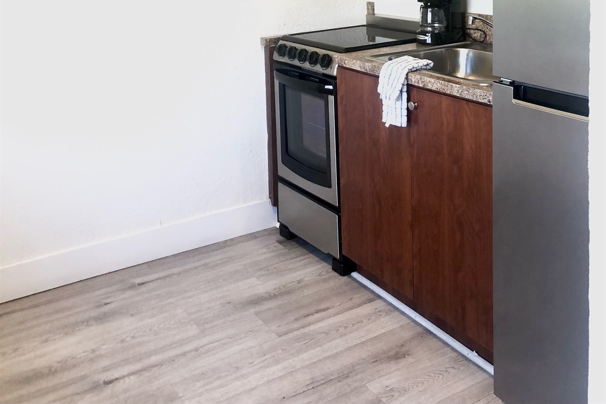 * Stainless-steel sink, refrigerator, freezer, and flat range stove with oven
